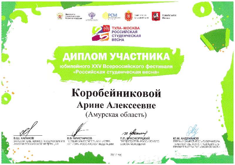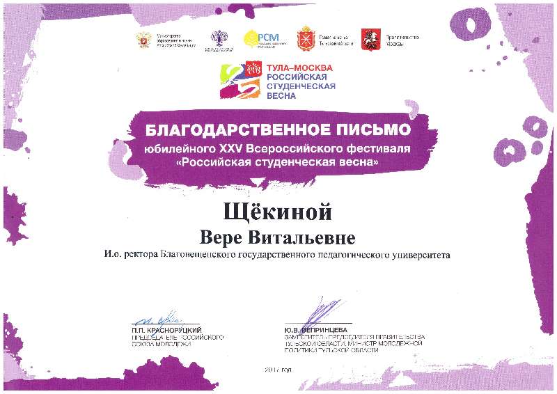 С 15 по 20 мая в городе Тула проходил 25-ый юбилейный фестиваль "Российская студенческая весна", в котором приняла участие студентка БГПУ Арина Коробейникова, вокалистка ансамбля "Акварель".