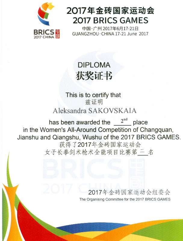 С 17 по 21 июня в южнокитайском городе Гуанчжоу (провинции Гуандун) прошли первые в истории Спортивные Игры стран БРИКС-2017. В программу соревнований вошли баскетбол, волейбол и единоборство ушу. Участие в Играх приняли более 300 спортсменов из пяти стран БРИКС: России, Китая, Бразилии, Индии и ЮАР.
