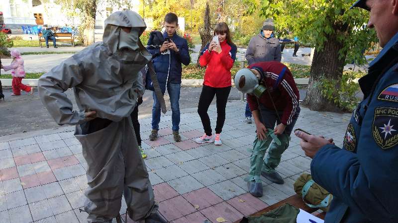надевали противогаз и общевойсковой защитный костюм, преодолевали условно