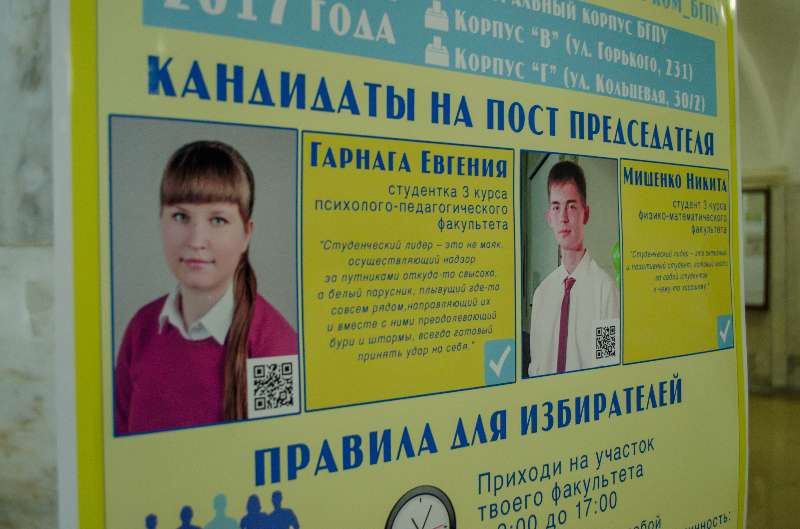 В рамках дорожной карты Всероссийской акции по выборам председателей советов, обучающихся «Твой выбор!», 13 ноября состоялась процедура голосования на трех избирательных участках, избирательное право имели все студенты очного отделения БГПУ. Всего приняло участие 177 студентов. По результатам голосования председателем совета обучающихся становится студентка 3 курса психолого-педагогического университета Евгения Андреевна Гарнага. Отдел по внеучебной работе, студенческая избирательная комиссия поздравляет Женю и Никиту с завершением выборов! Официальная встреча с председателем совета обучающихся состоится на Конференции обучающихся завтра, 15 ноября в 18:00 в 114 аудитории.