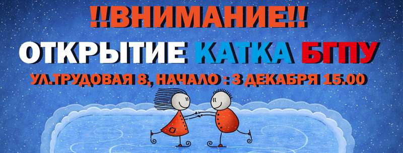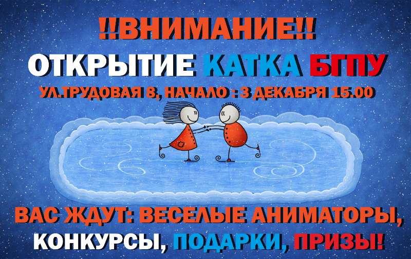 Приглашаем всех желающих на открытие катка БГПУ 3 декабря в 15.00. Каток находится по адресу: ул. Трудовая, 8 (во дворе за общежитием №3).