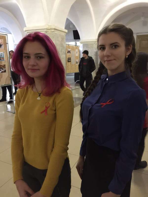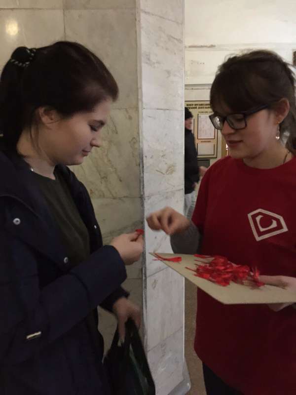 Ребята раздавали всем желающим красную ленту – символ борьбы со СПИДом. Кроме