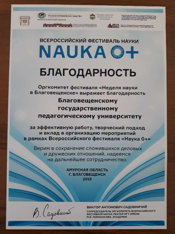 Оргкомитет фестиваля "Неделя науки в Благовещенске" выражает благодарность Благовещенскому государственному педагогическому университету за эффективную работу, творческий подход и вклад в организацию мероприятий в рамках Всероссийского фестиваля "Наука 0+"