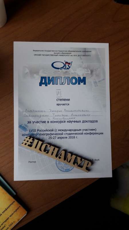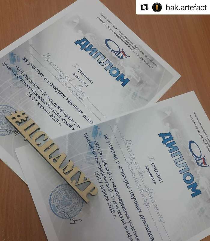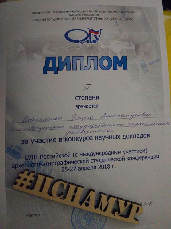 Российская археолого-этнографическая студенческая конференция проходит в г. Омске. От Благовещенска принимают участие 8 студентов БГПУ, подготовленные специалистами Центра по сохранению историко-культурного наследия Амурской области. В конференции принимают участие более 100 человек со всей России. Наши студенты заняли призовые места: Максимович Максим, Кулигина Софья - диплом первой степени за доклад «Использование археологических методов в работе над проектом Вахта Памяти» (секция Историография, теория и методология археологии). Лавриненко Эдуард, Завгородний Тимофей - диплом третьей степени, за доклад «Инновационные формы и методы популяризации археологии как науки на примере археологического клуба Благовещенска» (секция Музееведение и охрана культурного наследия); Кожемяко Дарья - диплом третьей степени за доклад «Проблемы автономии малых этнических групп Приамурья и религиозных общин» (молокане, баптисты, духоборы) (секция Антропологические проблемы современности). Также диплом третьей степени получила выпускница БГПУ (магистрантка ДВФУ и сотрудник Центра по сохранению историко-культурного наследия Амурской области) Крючко Евгения за доклад Интерьер мохэского жилища на территории Западного Приамурья (секция Средневековье и новое время). Заведующий кафедрой России и вспомогательных исторических дисциплин БГПУ Шеломихин Олег Анатольевич зачитал приветственный адрес ректора БГПУ с приглашением провести следующий 59 РАЭСК впервые в Благовещенске на базе БГПУ.