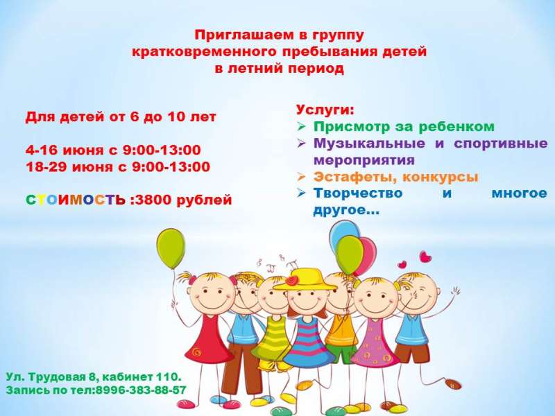 Новостная лентаПриглашаем в группу кратковременного пребывания детей в летний период8 Мая 2018Приглашаем в группу кратковременного пребывания детей в летний период Для детей от 6 до 10 лет 4-16 июня с 9:00 - 13:00 18-29 июня с 9:00 - 13:00 Услуги: Присмотр за ребенком Музыкальные и спортивные мероприятия Эстафеты, конкурсы Творчество и многое другое... Стоимость: 3800 рублей Обращаться: ул. Трудовая 8, кабинет 110. Запись по тел. 8996-383-88-57
