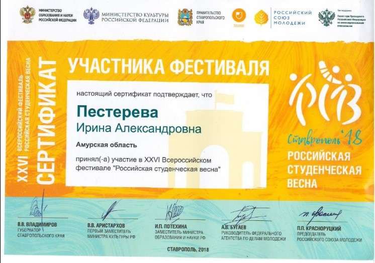 Двум студенткам БГПУ (Ирине Пестеревой и Ирине Шурыгиной, ИФФ) выпала честь принять участие в данном событии и вернуться в г. Благовещенск с новыми эмоциями, бесценным опытом и вдохновением! Участие студентов БГПУ в РСВ стало возможным по результатам Амурской студвесны, а также благодаря финансовой поддержке Министерства образования и науки Амурской области и БГПУ.