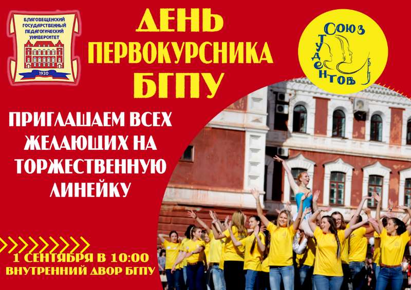 Новостная лентаДень Знаний в БГПУДень Знаний в БГПУ 1 сентября в 10.00 внутренний двор Приглашаем первокурсников, лицеистов, магистрантов и аспирантов на торжественную линейку, посвященную Дню знаний. 1 сентября в 10:00 во внутреннем дворе БГПУ (построение колонн с 9.40 с ул. Шимановского). Подробности: 771-689, 771-659 отдел по внеучебной работе