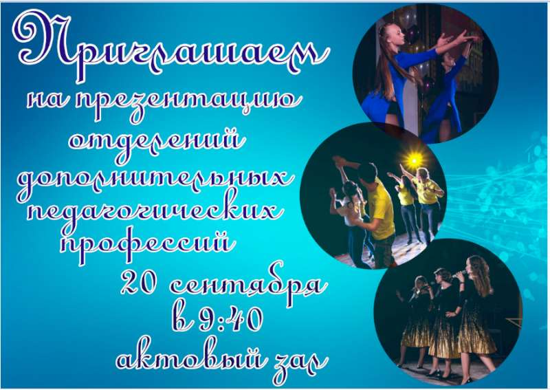 20 сентября в 9:40 состоится презентация отделений дополнительных педагогических профессий. Место проведения: актовый зал.