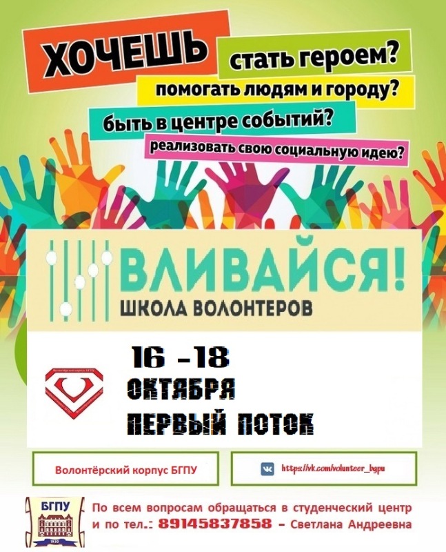 С 16 по 18 октября начнется первая волна школы волонтёров «Вливайся», которая будет проходить на базе БГПУ.