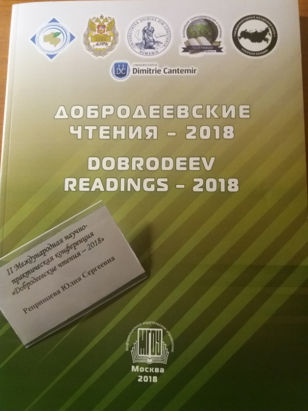 18 октября 2018 года заведующий кафедрой географии Репринцева Юлия Сергеевна выступила с научным докладом на II Международной научно-практической конференции «Добродеевские чтения – 2018», посвященной 75-летию кафедры геоэкологии Московского государственного областного университета. Конференция состоялась в г. Мытищи, Московской области. На пленарном заседании конференции выступили профессоры из Румынии (Университет Дмитрия Кантемира), Турции, Японии (Университет г. Осака). В рамках секционных докладов педагоги и учителя школ г. Москвы и Московской области обменялись опытом реализации Федерального государственного образовательного стандарта в основной школе, а также обсудили особенности преподавания естественнонаучных и технических дисциплин географического профиля в высших учебных заведениях.