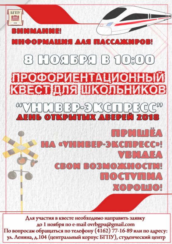 Приглашаем учащихся 9-11 классов, их родителей и учителей 8 ноября 2018 года на День открытых дверей в БГПУ! Для участия в профориентационном квесте "Универс-экспресс" необходимо отправить заявку до 1 ноября. Форма заявки, а также подробности проведения события представлены в информационном письме