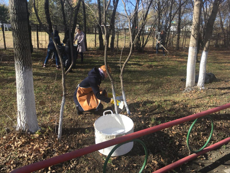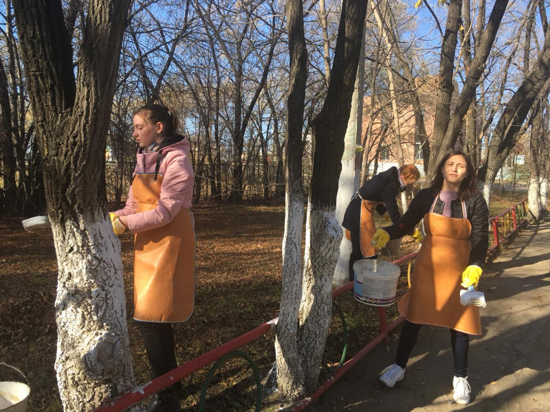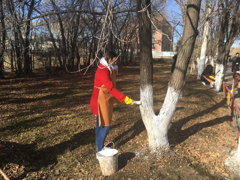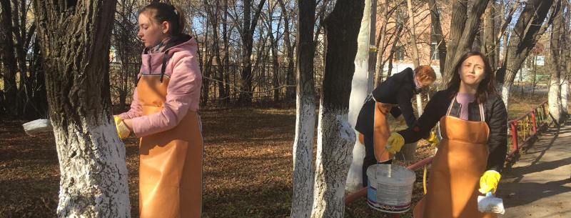 Силами студентов убрана опавшая листва, побелены деревья на прилегающей