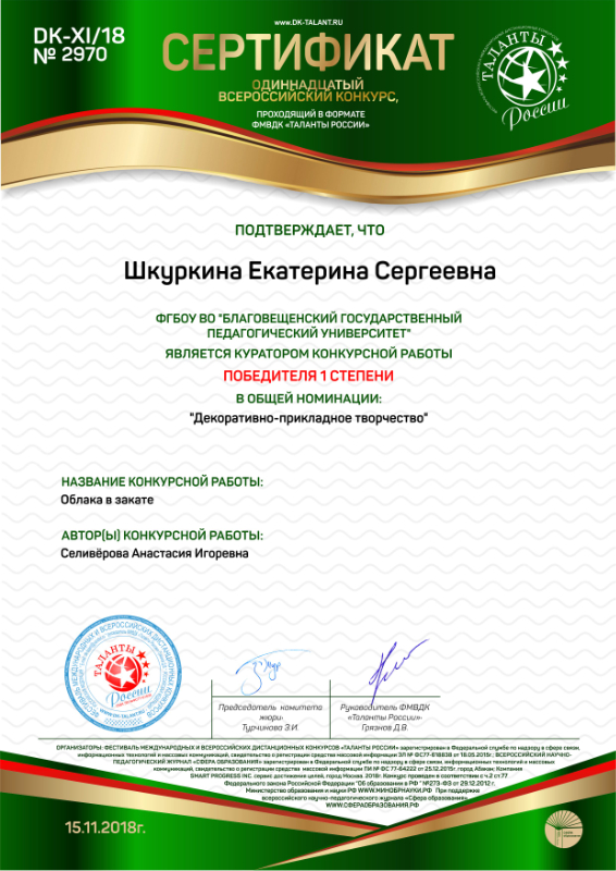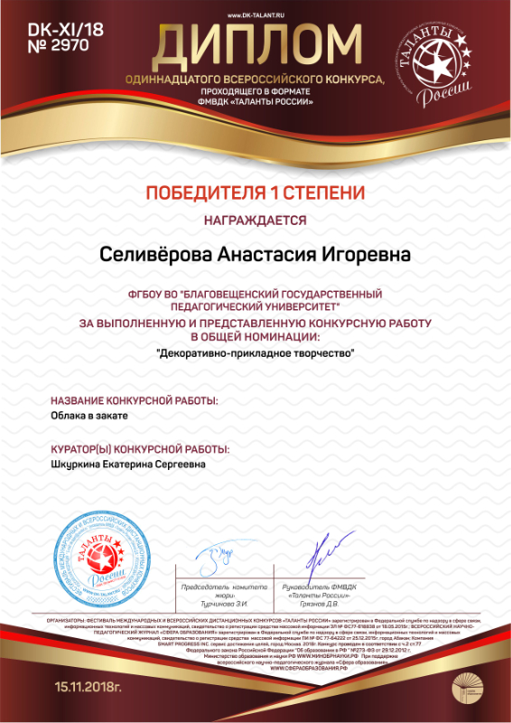 закате» в номинации «Декоративно-прикладное творчество» получила диплом победителя