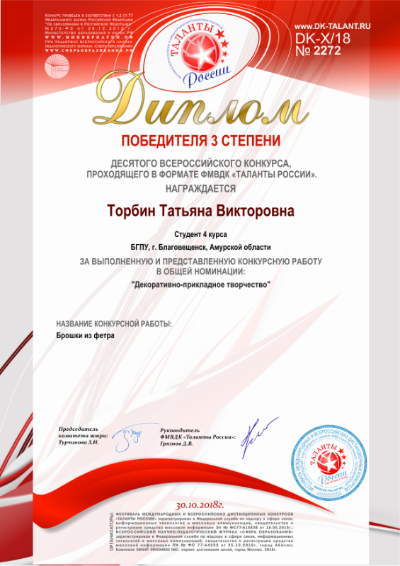 выполненную и представленную работу в «Брошки из фетра» в этой же номинации получила