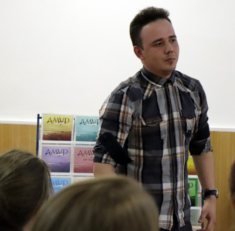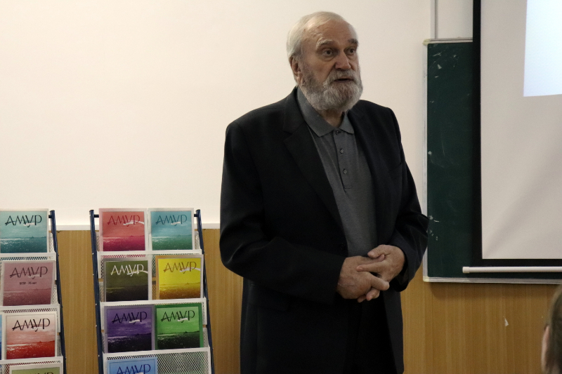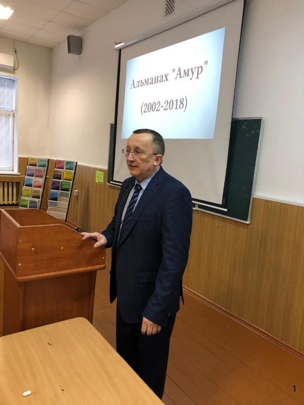 Итак, долгожданная презентация. Открывает ее выступление Александра Васильевича Урманова, главного редактора «Амура» и заведующего кафедрой русского языка и литературы (фото 1).