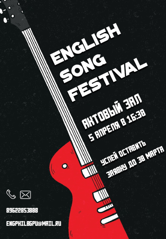 Кафедра английской филологии и методики преподавания английского языка педагогического университета приглашает студентов вузов, а также учащихся языковых и общеобразовательных школ принять участие в Фестивале английской песни, который состоится 5 апреля 2019 г. в 16.30 в актовом зале БГПУ. Всем участникам Фестиваля будут вручены сертификаты участия.
