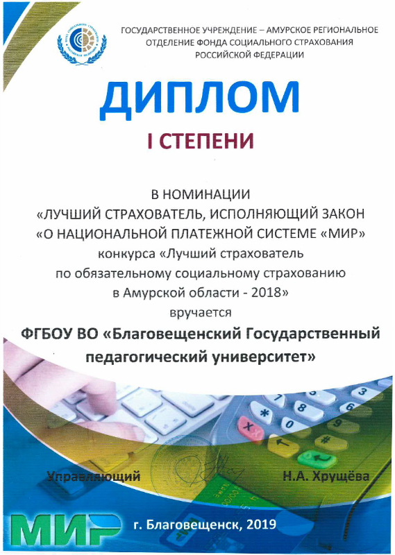 Новостная лента«Лучший страхователь по обязательному социальному страхованию в Амурской области - 2018».Государственное учреждение - Амурское региональное отделение Фонда социального страхования Российской Федерации (далее - региональное отделение) сообщает Вам итоги конкурса «Лучший страхователь по обязательному социальному страхованию в Амурской области - 2018». На основании решения конкурсной комиссии, ФГБОУ ВО «Благовещенский государственный педагогический университет», per. № 2800109044, признан победителем в номинации «Лучший страхователь, исполняющий закон «О национальной платежной системе «МИР» и награждается Дипломом I степени (Приказ ГУ-Амурского РО ФСС РФ от 25.02.2019 № 134 «Об утверждении результатов конкурса «Лучший страхователь по обязательному социальному страхованию в Амурской области - 2018»). Информация о победителях конкурса размещена на сайте регионального отделения wvvw. r2 8. fss .ru Благодарим за участие в конкурсе и примите наши искренние поздравления!