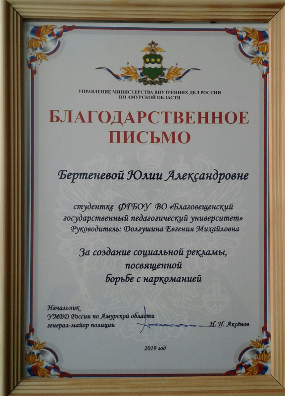 2. Студентка Бертенёва Юлия 4И, за создание социальной рекламы, посвященной борьбе с наркоманией, номинация «Социальный плакат»,