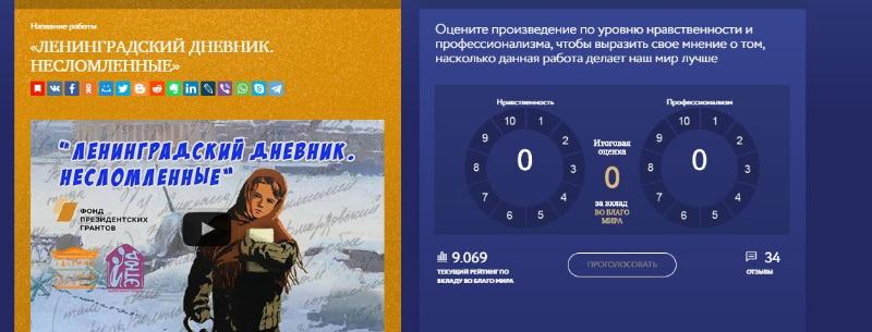 #НА_БЛАГО_МИРА Амурский спектакль «Ленинградский дневник. Несломленные» (по книге А. Адамовича и Д. Гранина, автор пьесы Оксана Конюх, режиссёр-постановщик Екатерина Набока), в рамках проекта «Листая страницы «Блокадной книги…» (при поддержке Фонда президентских грантов) принят на конкурс и номинирован на премию за доброту в искусстве «На Благо Мира». Данный спектакль был представлен на сцене БГПУ весной 2019 года для первокурсников. У проекта есть личный блог на сайте Премии, где можно найти ссылку на полную версию спектакля и ссылку на аудио книгу «Блокадная книга…» в исполнении юных актёров Образцовой театральной студии «Этюд» МБУК «Городской дом культуры» города Благовещенска. https://nablagomira.ru/vote/teatr/Leningradskiy_dnevnik_Neslomlennye До 1 ноября у всех желающих есть возможность поддержать и оценить на сайте Премии nablagomira.ru данный спектакль, а также многие другие работы.
