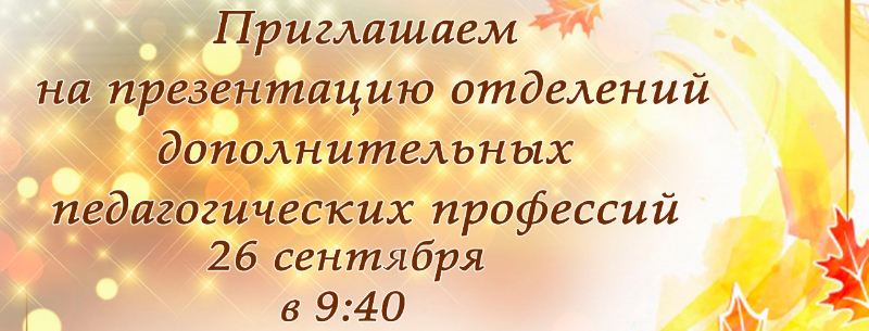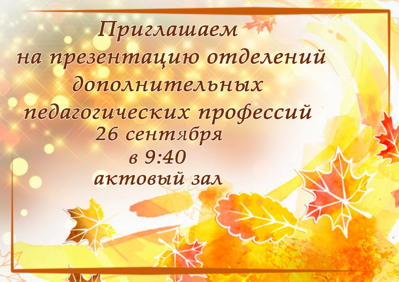 Приглашаем студентов БГПУ посетить презентацию отделения дополнительных педагогических профессий, которая состоится 26 сентября в 9:40 в актовом зале центрального корпуса. В ходе концерта-презентации вы сможете ознакомиться с полным перечнем направлений и записаться на занятия интересующего отделения.
