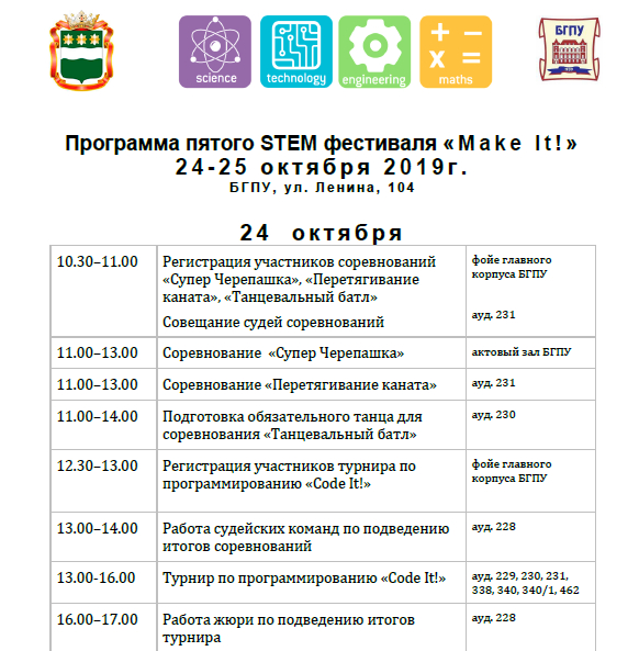 Уважаемые участники V STEM-фестиваля "Make it!"! К ознакомлению доступна программа фестиваля: http://www.bgpu.ru/newsfiles/5612_f1571621696771.pdf