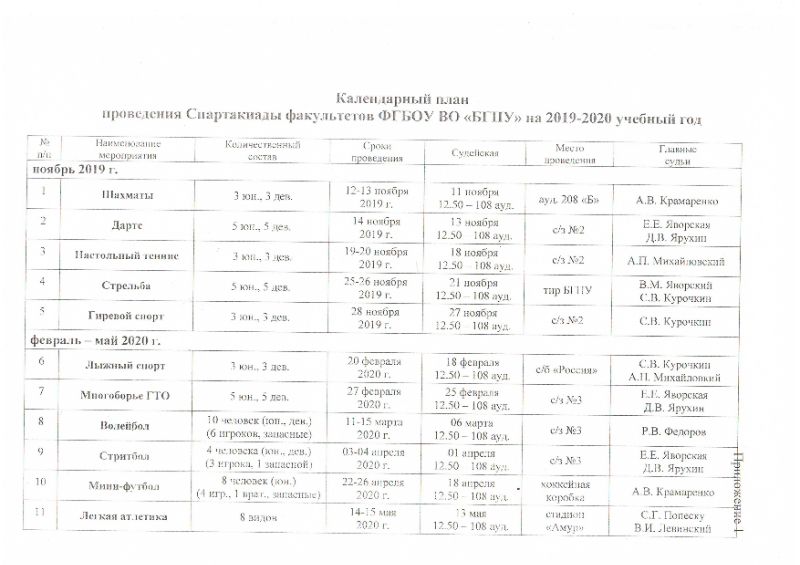 Спартакиада проводится в течение 2019-2020 учебного года среди команд факультетов по следующим видам спорта: