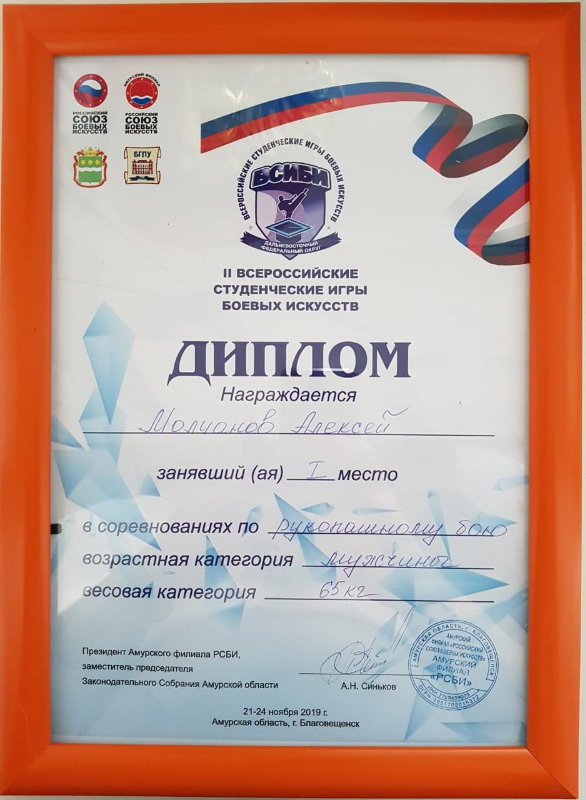 21-24 ноября 2019 года в рамках II Всеросиийских студенческих игр боевых искусств прошли соревнования по рукопашному бою. Студент БГПУ Молчанов Алексей занял 1 место в весовой категории 65 килограммов.
