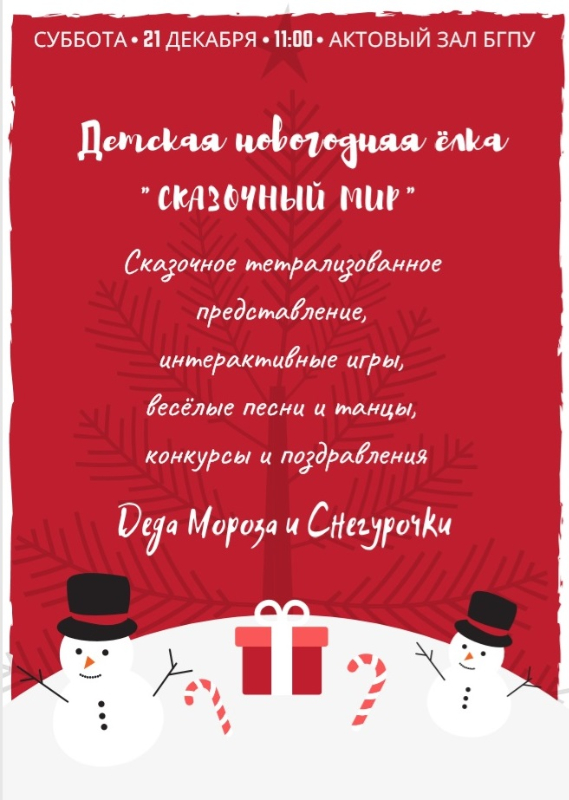 21 декабря в 11:00 в актовом зале БГПУ состоится новогодняя елка "Сказочный мир" для детей сотрудников и преподавателей БГПУ. В программе: сказочное театрализованное представление, интерактивные игры, веселые песни и танцы, поздравление от Деда Мороза и Снегурочки.