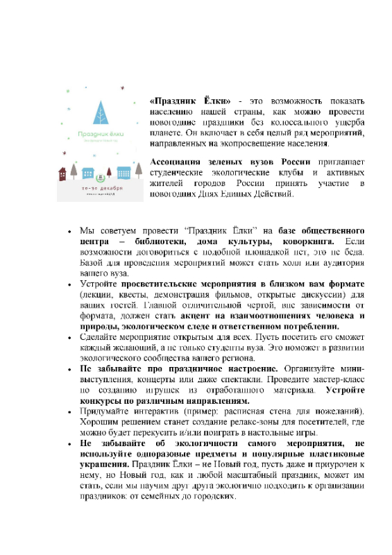 Участникам – экологическим клубам и послам акции – предоставляются инструкции, обучающие вебинары и «меню мероприятий» (прилагается к данному письму), которые помогут им организовать «Праздник Ёлки» в своём учебном заведении или регионе. Более подробную информацию об акции можно найти в официальном письме-приглашении, прикрепляемом к данному письму, а также на Интернет-ресурсах Ассоциации «зелёных» вузов России: