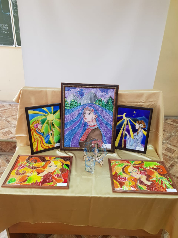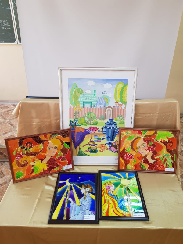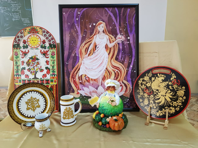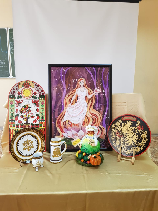 Были представлены творческие работы студентов 3 курса «ИД», выполненные в разных техниках декоративно-прикладного направления: батик, поинт ту поинт, имитация витража, роспись по дереву, декоративный натюрморт, папье-маше, роспись по стеклу, авторские куклы и монументальная искусство.