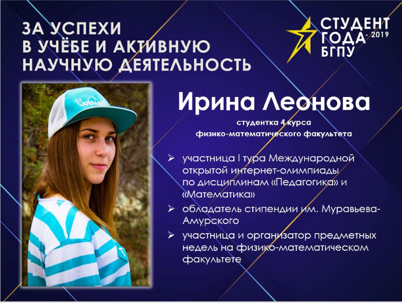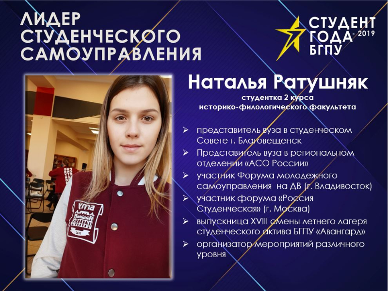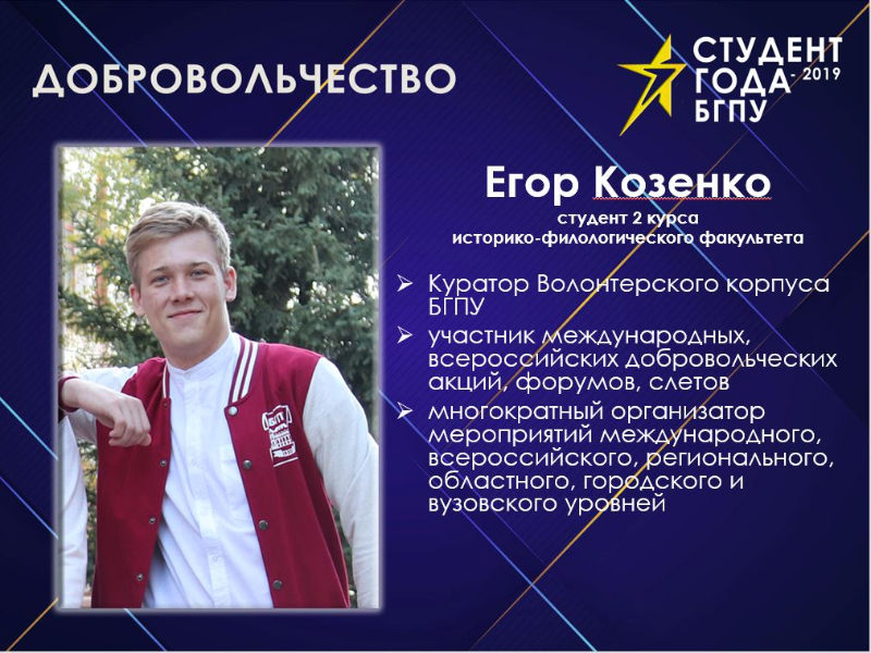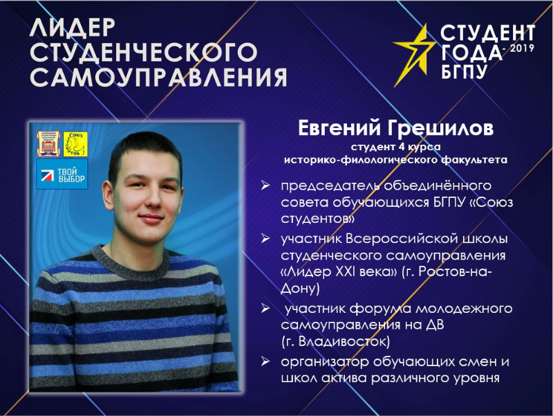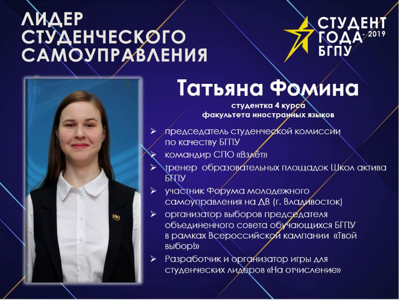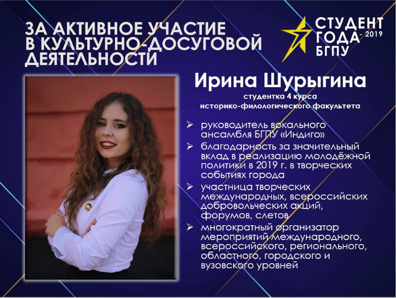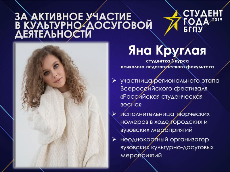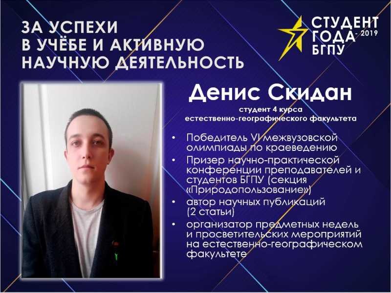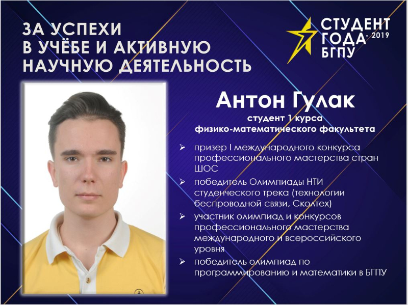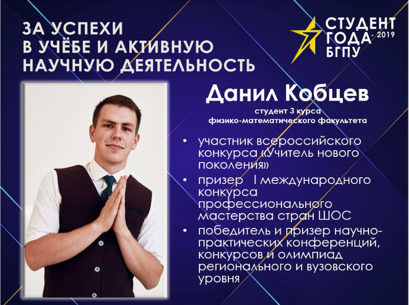 Для участия в конкурсе "Студент года - 2019" портфолио, подтверждающее индивидуальные достижения, подали 30 участников. Предлагаем к ознакомлению и приглашаем на церемонию награждения, которая состоится 24 января в 13:00 в актовом зале БГПУ.