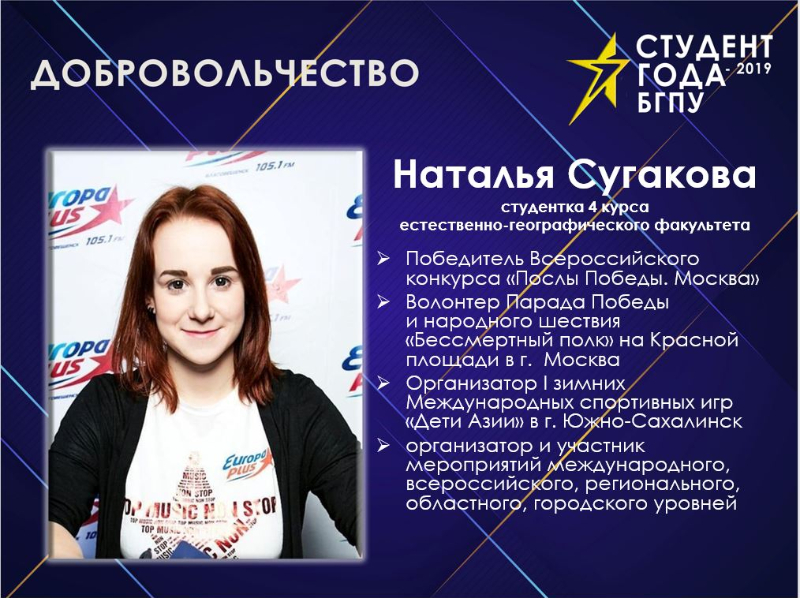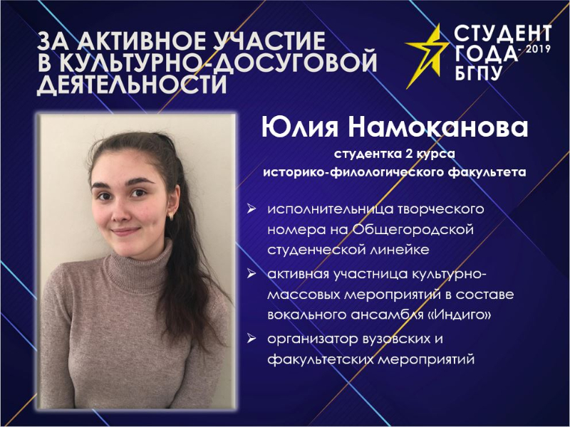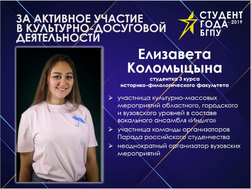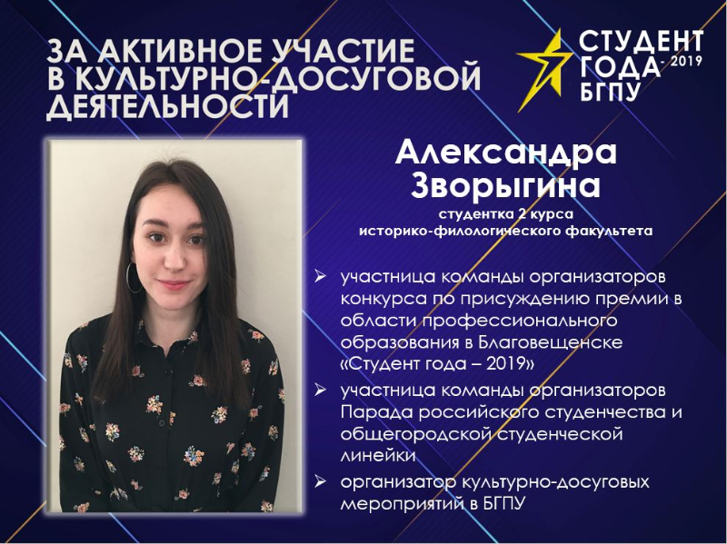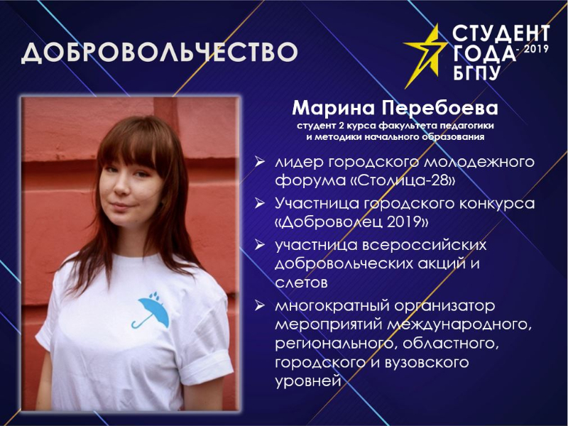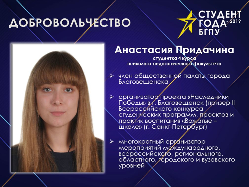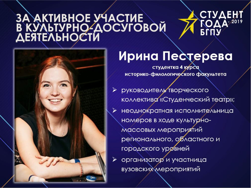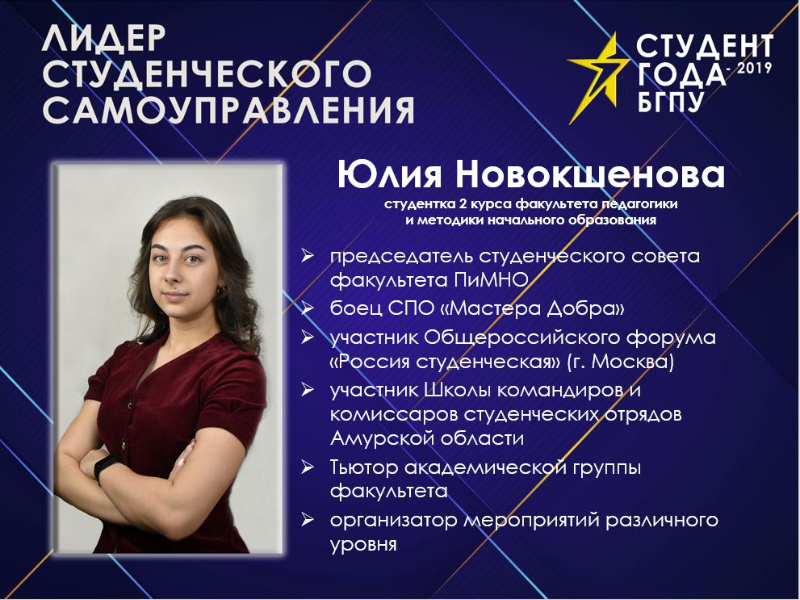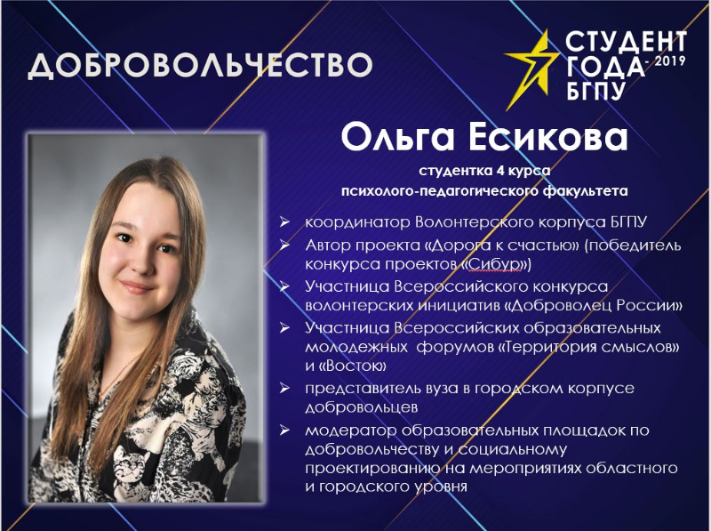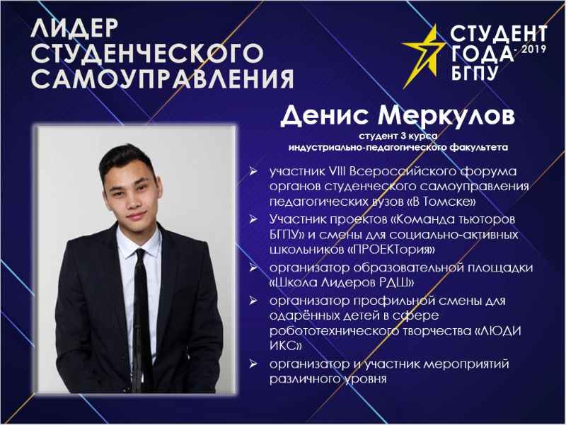 Для участия в конкурсе "Студент года - 2019" портфолио, подтверждающее индивидуальные достижения, подали 30 участников. Предлагаем к ознакомлению и приглашаем на церемонию награждения, которая состоится 24 января в 13:00 в актовом зале БГПУ.