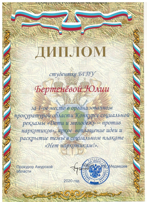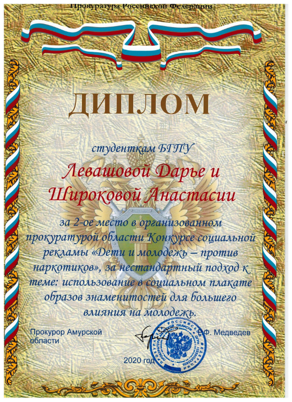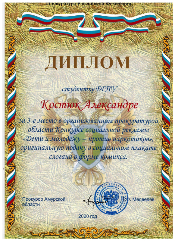 28 февраля 2020 г., состоялось награждение дипломами победителей конкурса «Дети и молодежь – против наркотиков!», организованного Прокуратурой Амурской области совместно с Амурским областным наркологическим диспансером, молодежными, общественными организациями и СМИ.