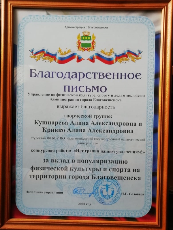 За вклад популяризацию физической культуры и спорта на территории города Благовещенска