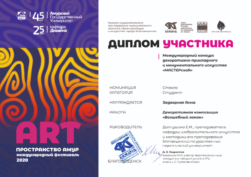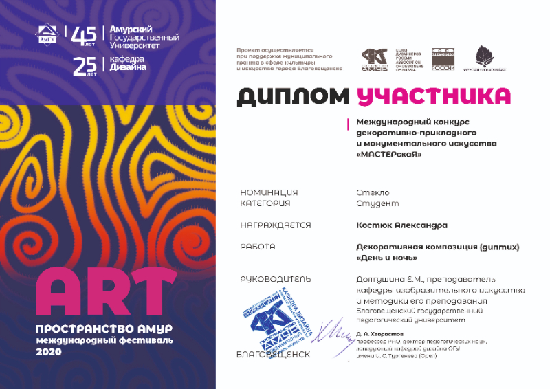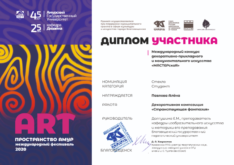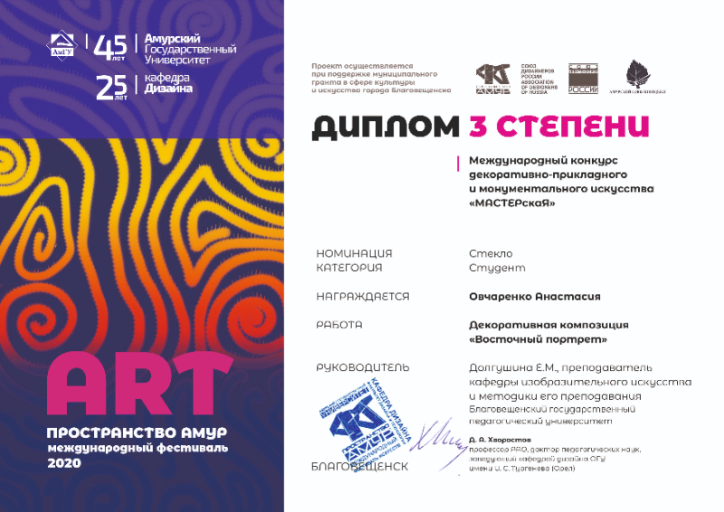 22 апреля 2020 г. в г. Благовещенске Амурской области в рамках фестиваля «АРТ ПРОСТРАНСТВО АМУР» подведены итоги Международного конкурса декоративно-прикладного и монументального искусства «МАСТЕРскаЯ».