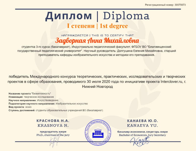 получила диплом I степени за проект