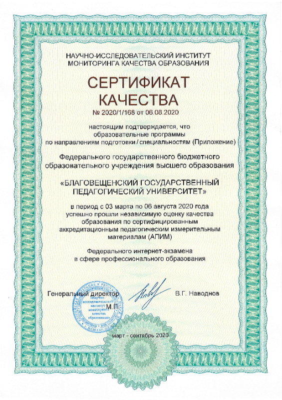 Научно-исследовательский институт мониторинга качества образования присвоил БГПУ сертификат качества по итогам успешного прохождения Федерального интернет-экзамена в сфере профессионального образования по сертифицированным аккредитационным педагогическим измерительным материалам во втором семестре 2019-20 учебного года.