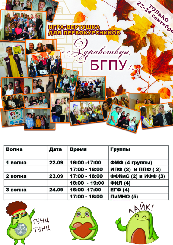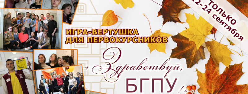 С 22 по 24 сентября 2020 года в стенах Педагогического пройдет традиционная игра-вертушка для первокурсников "Здравствуй, БГПУ". Команда организаторов в