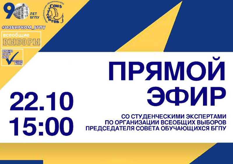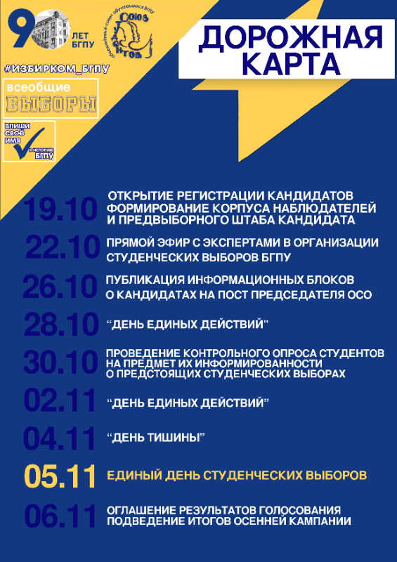 Новостная лентаДорожная карта всеобщих студенческих выборов 202019 октября открыта регистрация кандидатов на пост председателя ОСО "Союз студентов". Кандидатам необходимо написать заявление в студенческом центре, а также предложить кандидатуру в корпус наблюдателей за всеобщими выборами. 22 октября в 15:00 в инста-аккаунте студсовета @bgpu_oso состоится прямой эфир со студенческими экспертами по организации всеобщих выборов в разные годы. Это кандидат 2019 года и нынешний председатель ОСО " Союз студентов Евгений Грешилов, студент ИФФ; председатель студенческой избирательной комиссии 2018 года Татьяна Фомина, студентка ФИЯ и член студенческой избирательной комиссии в 2019 году от ЕГФ Стефаненко Анастасия. Дни единых действий кандидатов подразумевают разные формы взаимодействия с электоратом, с презентацией собственной предвыборной программы. По вопросам организации выборов можно обращаться в студенческий центр. Актуальная информация публикуется в социальных сетях под тегом #ИЗБИРКОМ_БГПУ