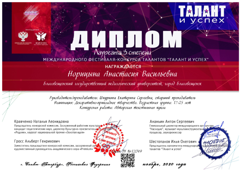 текстильная кукла», в номинации: декоративно-прикладное творчество, стала