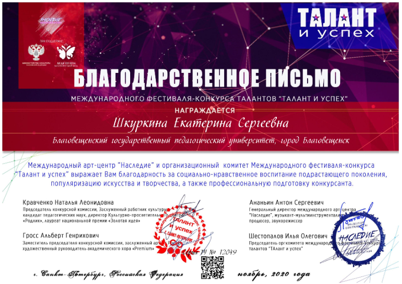 участие в Международном конкурсе талантов «Талант и успех», который проходил с