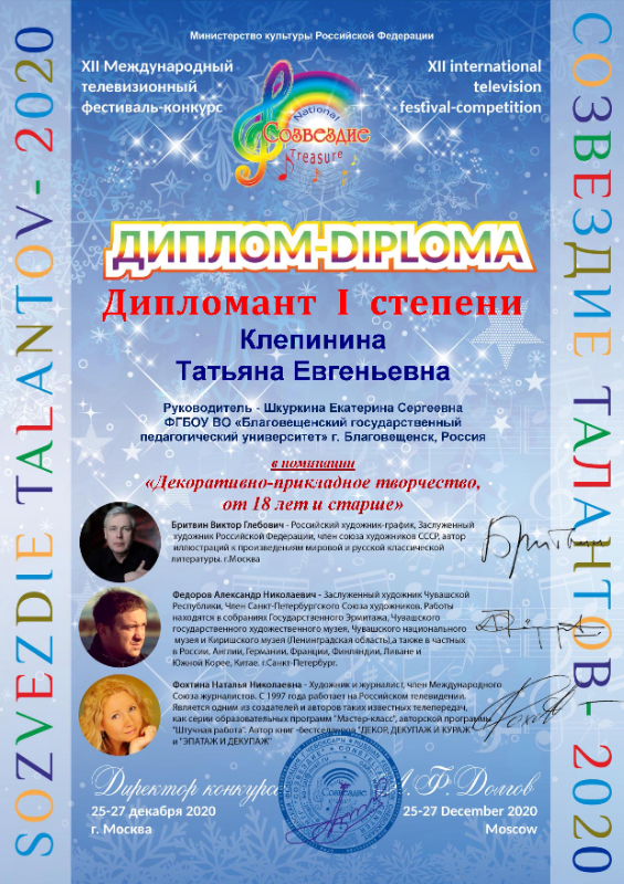 и декоративно-прикладное творчество» стала дипломантом I степени. Клепинина Татьяна