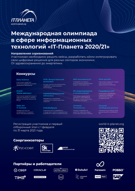 Приглашаем студентов IT-специальностей принять участие в XIII сезоне Международной Олимпиады в сфере информационных технологий «IT-Планета 2020/21». Олимпиада «IT-Планета» - это международные соревнования для студентов и молодых специалистов IT-сферы, которые проводятся уже 13 лет и дают шанс всем желающим проявить себя в сфере информационных технологий! Став участником Олимпиады, вы сможете: понять реальные потребности работодателей; повысить свою практическую подготовку; улучшить собственные профессиональные навыки; пообщаться с высококлассными специалистами; стать частью профессионального it-сообщества; получить дипломы, медали и ценные подарки от партнёров IT-Олимпиады; стать востребованным молодым специалистом на рынке труда и построить успешную карьеру не только в ИТ-компаниях, но и на предприятиях других отраслей экономики! Этапы соревнований: с 1 февраля по 31 марта: регистрация участников и первый отборочный этап (решение простых кейсов и задач); с 10 по 25 апреля: основной этап соревнований (решение усложнённых задач или защита проектов, онлайн-школа); с 28-31 мая: финал (защита итоговых проектов и награждение). Регистрация проходит на сайте world-it-planet.org Соревнования: Data Science Участникам предстоит выполнить задание на основе технологии DataScience; Oracle «Базы данных» Участникам предстоит решать задачи, связанные с базами данных на основе технологий Oracle. DataArt IT Contest Конкурс для тех, кто интересуется IT и изучает языки программирования; OCR. Искусственный интеллект Конкурс для тех кто интересуется и работает с искусственным интеллектом; Администрирование AstraLinux Разработка и построение защищённых информационных сервисов; РобоФабрика Участники смогут разработать и представить свои инновационные разработки в области робототехники; NEO возможности Участники могут создавать инновации для улучшения уровня жизни людей с инвалидностью; Web-дизайн Участникам предстоит создать сайт межпланетного туристического агентства; Разработка APP Необходимо разработать и защитить созданное приложения на одну из 10 заданных тем; Лучший свободный диплом Участники могут внести свой вклад в развитие свободного ПО; 3D-моделирование и визуализация Участникам предлагается проверить свои навыки в 3D-проектировании домов в необычных локациях; Сетевые Технологии Конкурс направлен на развитие навыков в сфере телекоммуникаций и сетевых технологий. Кто может принять участие: Студенты от 16 до 27 лет, любого курса и формы обучения высшего и среднего профессионального образования или дипломированные специалисты любой страны мира. Участие бесплатное для всех!