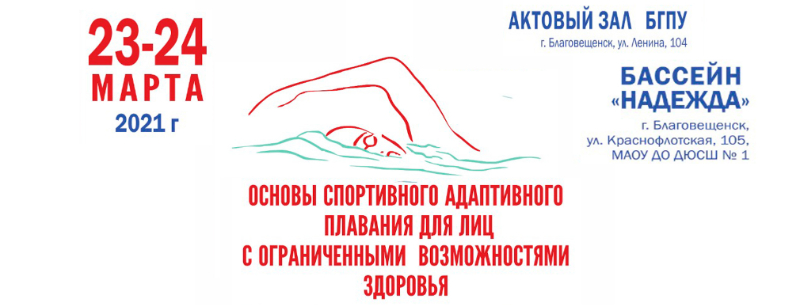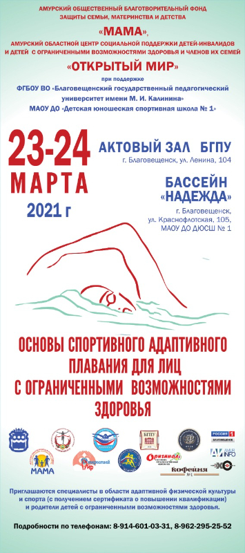 АОБФ защиты семьи, материнства и детства «МАМА» и АНО АОЦ «Открытый мир", при поддержке БГПУ и МАОУ ДО «ДЮСШ № 1 г. Благовещенска» бассейн «Надежда» приглашают специалистов в области адаптивной физической культуры и спорта и студентов профильных учебных заведений приглашают 23-24 марта 2021 г. принять участие в семинаре-практикуме «Основы спортивного адаптивного плавания для лиц с ограниченными возможностями здоровья».