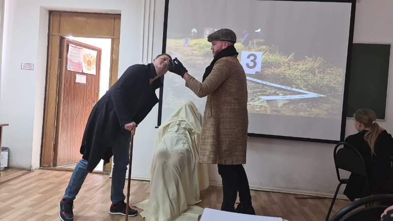 использованы разные реквизиты, музыкальное и видео сопровождение, техническое