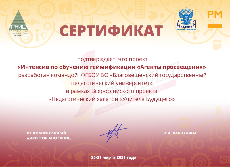 С 25 по 31 марта проходил очный этап (в онлайн формате) Всероссийского проекта "Педагогический хакатон "Учителя будущего". Основная цель хакатона - подготовка проектных педагогических команд, привлеченных к формированию образа учителя нового формата и разработке новых проектных решений по направлениям Национального проекта "Образование". В очном этапе Педагогического хакатона принимали участие команды с 20 педагогических университетов всех федеральных округов РФ. Наш вуз представляла команда студентов и сотрудников - Селезнева О.В., Воронина М.В., Овчаренко Анастасия (ППФ), Фомина Татьяна (ФИЯ), Шарудина Екатерина (ИФФ), Перцев Евгений (ИФФ), Кобцев Данил (ФМФ). В течение недели наша команда занималась разработкой проекта "Интенсив по обучению геймификации "Агенты просвещения", а также подготовкой к публичной защите перед экспертами грантовых конкурсов. По итогам проведения защиты проектных решений наш проект вошел в ТОП-лист лучших проектов и получил письмо поддержки от ФГАОУ ДПО "Академия Минпросвещения России" а рамках Всероссийского конкурса молодежных проектов.