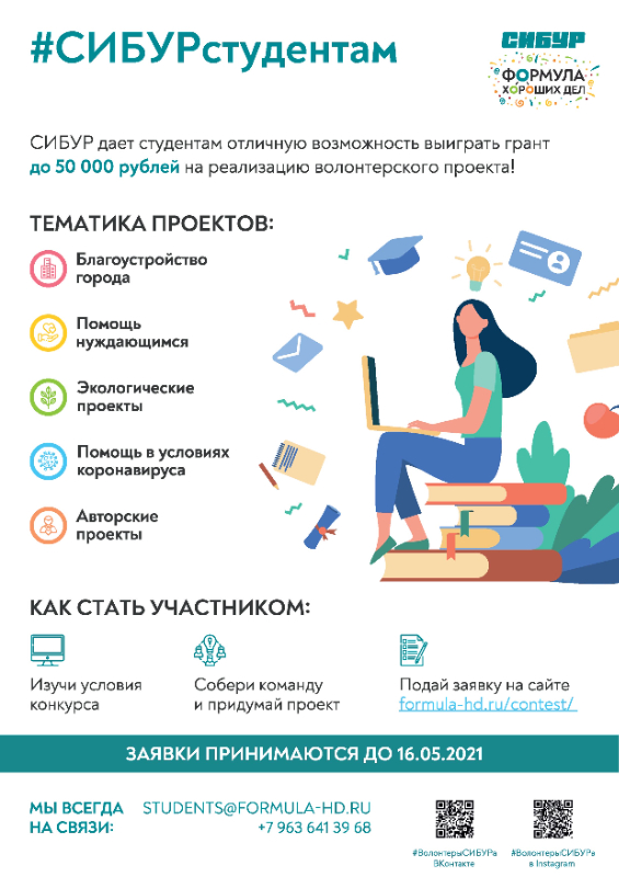 По всем вопросам участия в конкурсе, в том числе регистрации личного кабинета на сайте программы «Формула хороших дел», обращаться к координаторам волонтерской программы: +7-963-641-39-68, students@formula-hd.ru.