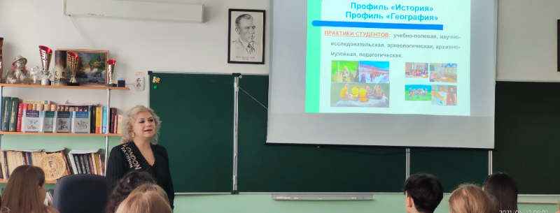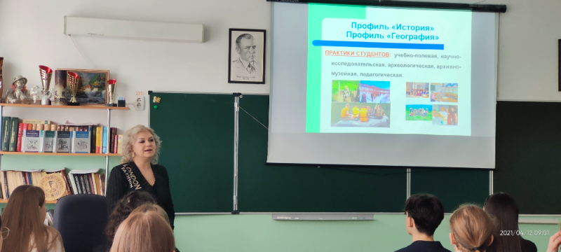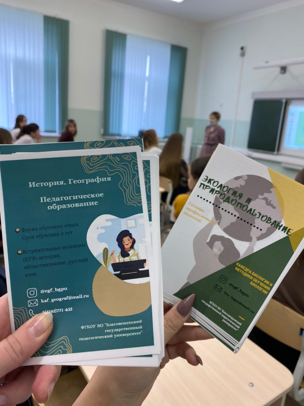 На протяжении марта-апреля 2021 года преподаватели кафедры географии вместе со студентами 3-4 курсов профиль «Биология», профиль «География» проводили профориентационные встречи с обучающимися 10-11 классов школ города Благовещенска (школы № 1, 4, 6, 11, 16, 22, 25, 27, 28, Лицей БГПУ). Преподаватели рассказывали про особенности обучения в БГПУ, демонстрировали на презентации факультеты, показывали видеосюжеты, студенты рассказывали про студенческую жизнь в БГПУ, делились своими успехами, как в учебной, так и в внеучебной деятельности. По окончанию встреч, студенты раздавали флаеры-буклеты с общей информацией по поступлению в университет
