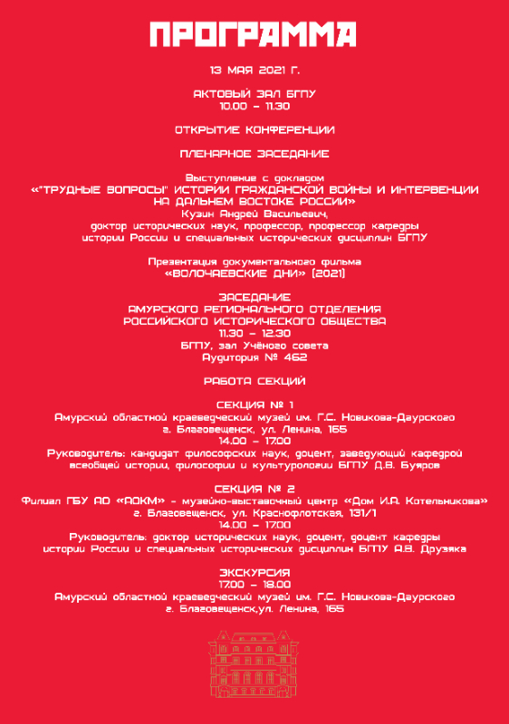 Работа Секции 2 пройдет на базе Филиала ГБУ АО «АОКМ» - музейно-выставочный центр «Дом И.А. Котельникова» (г. Благовещенск, ул. Краснофлотская, 131/1).