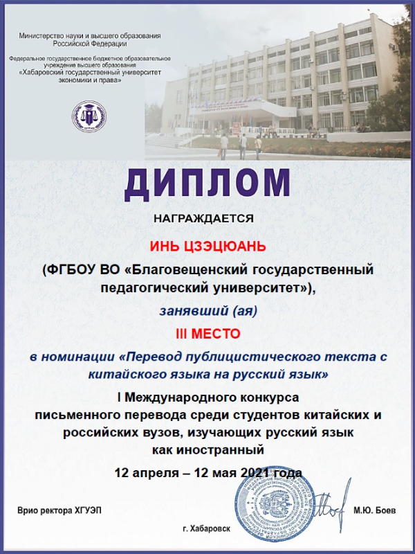 Студенты международного факультета приняли участие в международном конкурсе письменного перевода для студентов, изучающих русский язык как иностранный. Организатором конкурса выступил Хабаровский государственный университет экономики и права. Более 50 участников российских и китайских вузов состязались в двух номинациях: «Перевод научно-популярного текста с китайского языка на русский язык» и «Перевод публицистического текста с китайского языка на русский язык». Участники должны были перевести текст об эпидемии короновируса и его влиянии на структуру мировой экономики, а также статью о социальной значимости сокращенных «модных словечек» в Интернете. Бакалавры 4 курса международного факультета У ЦЗЯНЬЖУН и ИНЬ ЦЗЭЦЮАНЬ заняли призовые места в номинации «Перевод публицистического текста с китайского языка на русский язык». Поздравляем ребят и желаем им дальнейших профессиональных успехов!